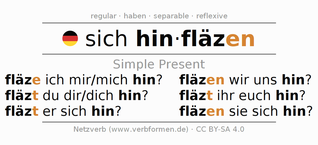 The verb sich hinfläzen fully conjugated in all persons and numbers in the Present Indicative