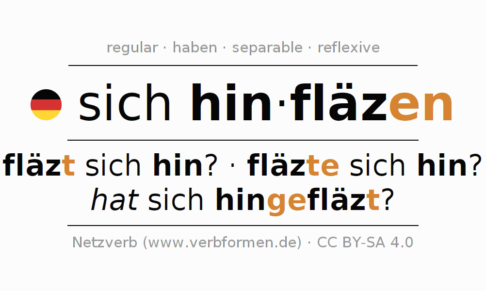 The conjugation of sich hinfläzen in Present Indicative Presence Active is fläze ich mir/mich hin?, fläzt du dir/dich hin?, fläzt er sich hin?, fläzen wir uns hin?, fläzt ihr euch hin?, fläzen sie sich hin?.The conjugation corresponds to certain grammatical rules. Likewise the requirements for the conjugation of the simple verb forms of hinfläzen in Present. Comments ☆