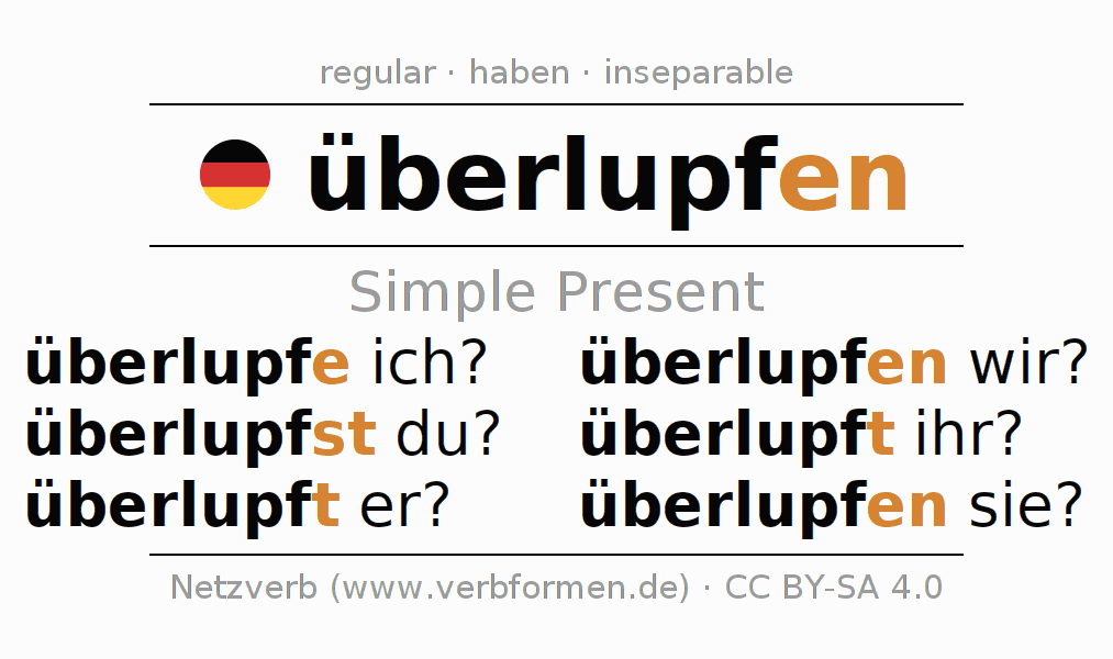 The verb überlupfen fully conjugated in all persons and numbers in the Present Indicative