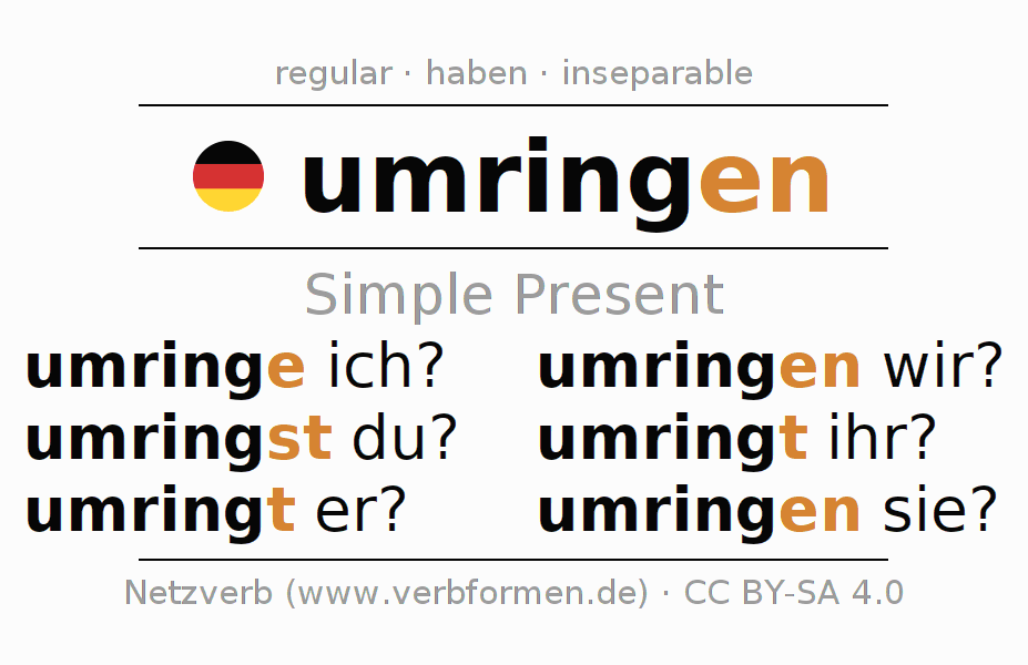The conjugation of umringen in Present Indicative Presence Active is umringe ich?, umringst du?, umringt er?, umringen wir?, umringt ihr?, umringen sie?.The conjugation corresponds to certain grammatical rules. Likewise the requirements for the conjugation of the simple verb forms of umringen in Present. Comments ☆