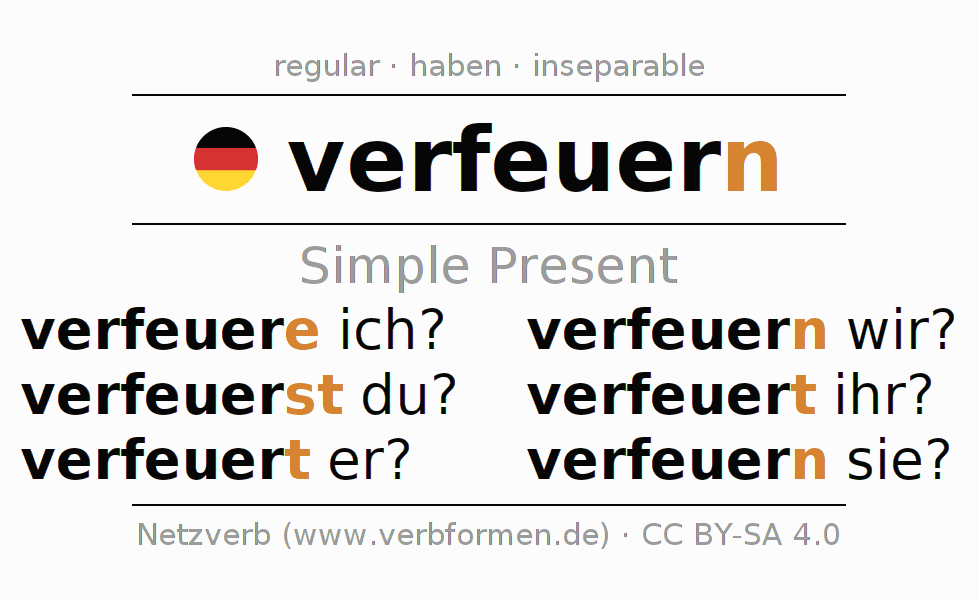 The conjugation of verfeuern in Present Indicative Presence Active is verfeu(e)re ich?, verfeuerst du?, verfeuert er?, verfeuern wir?, verfeuert ihr?, verfeuern sie?.The conjugation corresponds to certain grammatical rules. Likewise the requirements for the conjugation of the simple verb forms of verfeuern in Present. Comments ☆