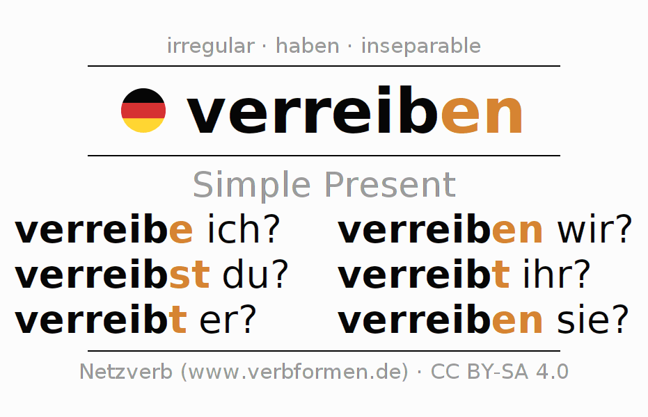 The conjugation of verreiben in Present Indicative Presence Active is verreibe ich?, verreibst du?, verreibt er?, verreiben wir?, verreibt ihr?, verreiben sie?.The conjugation corresponds to certain grammatical rules. Likewise the requirements for the conjugation of the simple verb forms of verreiben in Present. Comments ☆