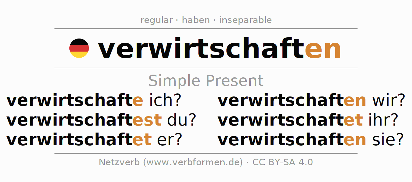 The conjugation of verwirtschaften in Present Indicative Presence Active is verwirtschafte ich?, verwirtschaftest du?, verwirtschaftet er?, verwirtschaften wir?, verwirtschaftet ihr?, verwirtschaften sie?.The conjugation corresponds to certain grammatical rules. Likewise the requirements for the conjugation of the simple verb forms of verwirtschaften in Present. Comments ☆