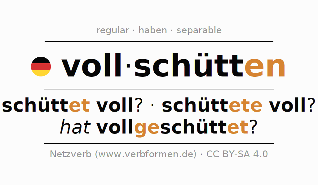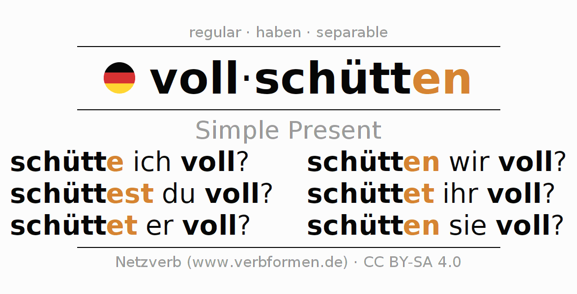 The conjugation of vollschütten in Present Indicative Presence Active is schütte ich voll?, schüttest du voll?, schüttet er voll?, schütten wir voll?, schüttet ihr voll?, schütten sie voll?.The conjugation corresponds to certain grammatical rules. Likewise the requirements for the conjugation of the simple verb forms of vollschütten in Present. Comments ☆