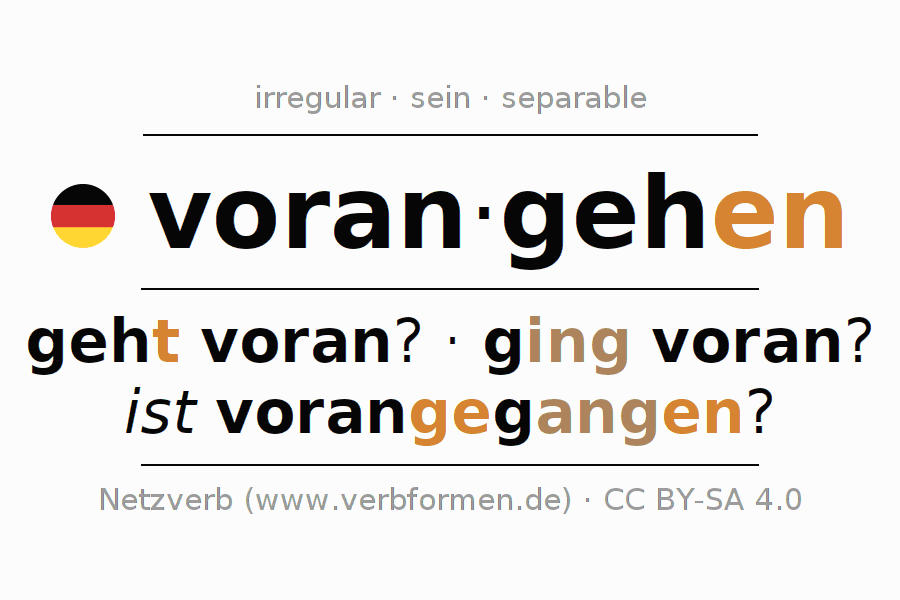 The conjugation of vorangehen in Present Indicative Presence Active is gehe ich voran?, gehst du voran?, geht er voran?, gehen wir voran?, geht ihr voran?, gehen sie voran?.The conjugation corresponds to certain grammatical rules. Likewise the requirements for the conjugation of the simple verb forms of vorangehen in Present. Comments ☆