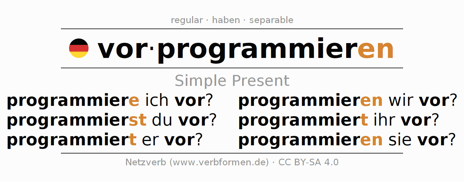 The verb vorprogrammieren fully conjugated in all persons and numbers in the Present Indicative