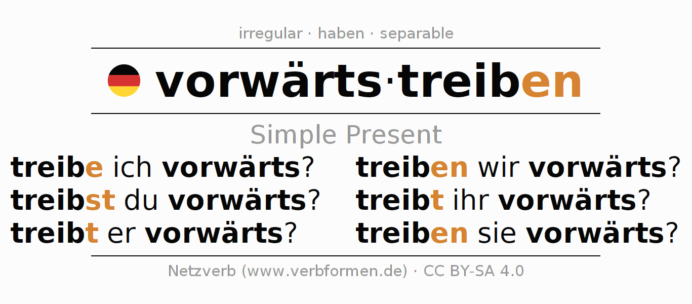 The verb vorwärtstreiben fully conjugated in all persons and numbers in the Present Indicative
