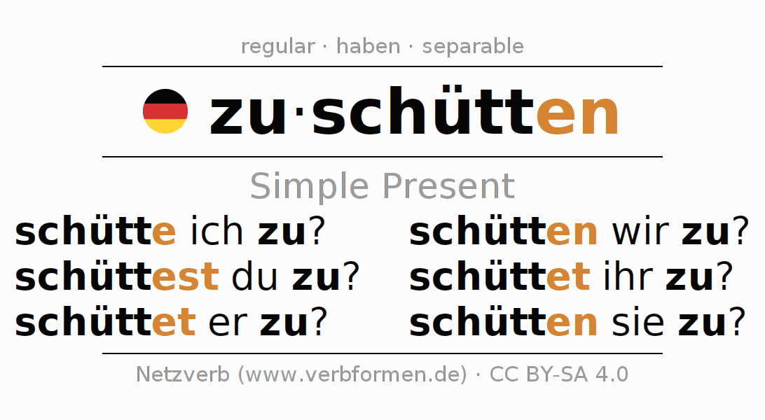 The conjugation of zuschütten in Present Indicative Presence Active is schütte ich zu?, schüttest du zu?, schüttet er zu?, schütten wir zu?, schüttet ihr zu?, schütten sie zu?.The conjugation corresponds to certain grammatical rules. Likewise the requirements for the conjugation of the simple verb forms of zuschütten in Present. Comments ☆