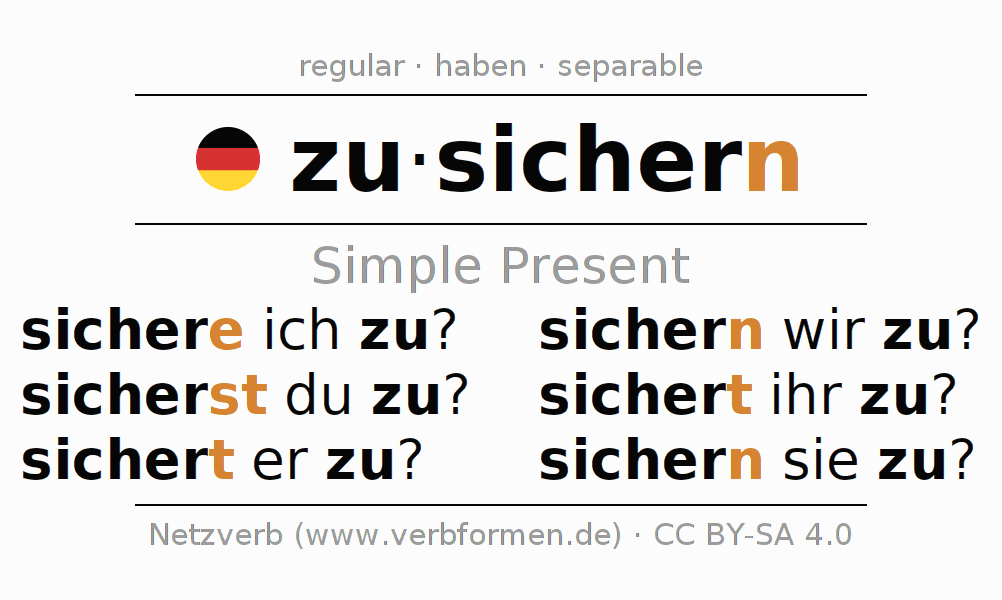 The conjugation of zusichern in Present Indicative Presence Active is sich(e)re ich zu?, sicherst du zu?, sichert er zu?, sichern wir zu?, sichert ihr zu?, sichern sie zu?.The conjugation corresponds to certain grammatical rules. Likewise the requirements for the conjugation of the simple verb forms of zusichern in Present. Comments ☆
