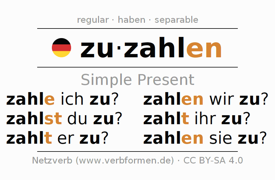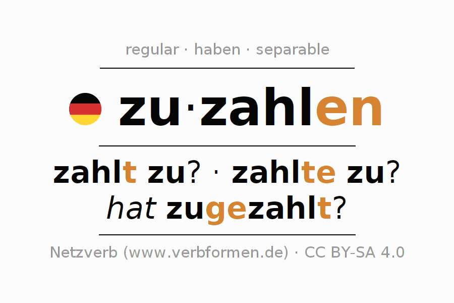 The conjugation of zuzahlen in Present Indicative Presence Active is zahle ich zu?, zahlst du zu?, zahlt er zu?, zahlen wir zu?, zahlt ihr zu?, zahlen sie zu?.The conjugation corresponds to certain grammatical rules. Likewise the requirements for the conjugation of the simple verb forms of zuzahlen in Present. Comments ☆