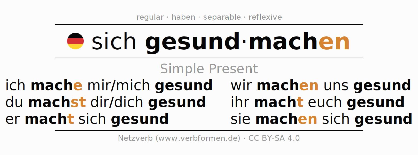 The conjugation of sich gesundmachen (recuperate, cure) in the present tense is: ich mache mir/mich gesund, du machst dir/dich gesund, er macht sich gesund, wir machen uns gesund, ihr macht euch gesund, sie machen sich gesund. For this purpose, the endings -e, -st, -t, -en, -t, -en are appended to the stem mach. The prefix gesund- of sich gesundmachen is separated.The formation of the forms corresponds to the grammatical rules for the conjugation of the verbs in the present tense. Comments ☆
