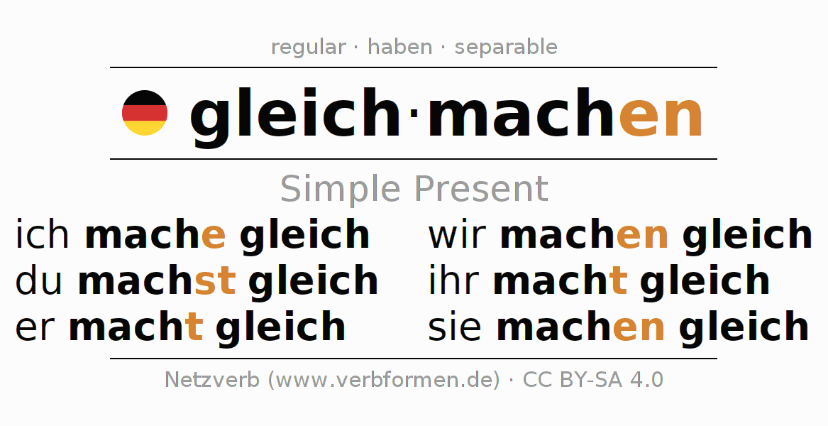 The verb gleichmachen fully conjugated in all persons and numbers in the Present Indicative