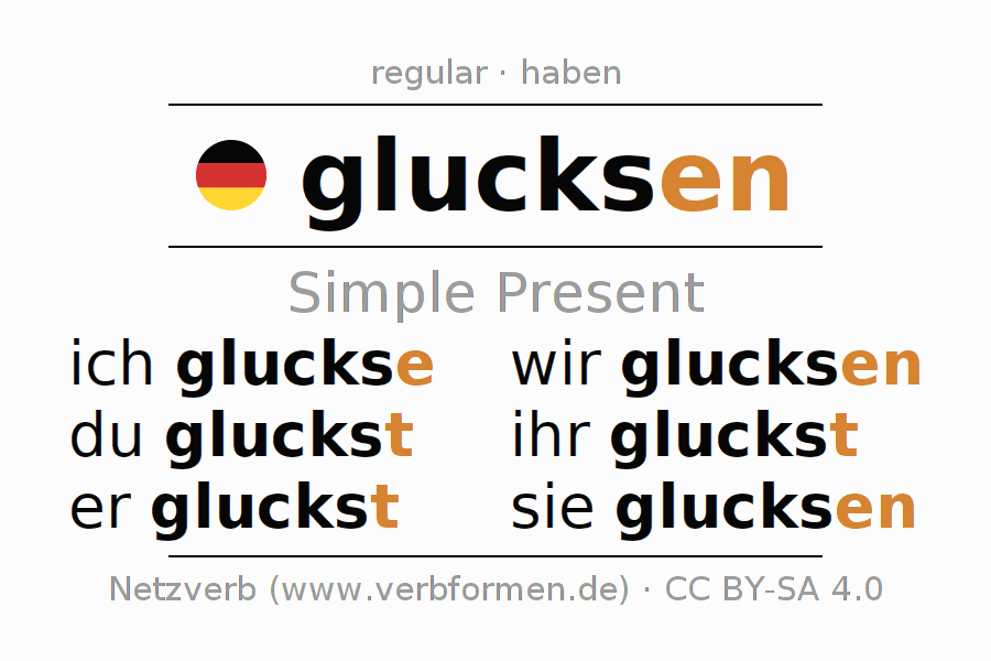 The verb glucksen fully conjugated in all persons and numbers in the Present Indicative