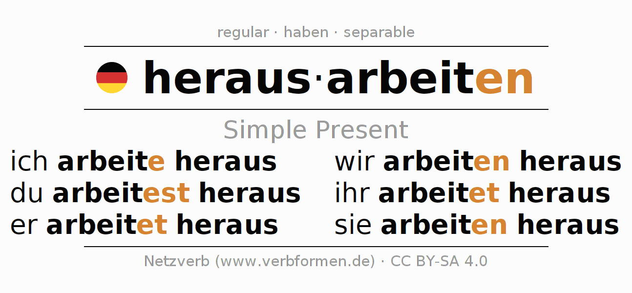 The conjugation of herausarbeiten (bring out, carve out) in the present tense is: ich arbeite heraus, du arbeitest heraus, er arbeitet heraus, wir arbeiten heraus, ihr arbeitet heraus, sie arbeiten heraus. For this purpose, the endings -e, -est, -et, -en, -et, -en are appended to the stem arbeit. The endings in the 2nd and 3rd person singular and in the 2nd person plural are extended by "e", as the stem ends on -t. The prefix heraus- of herausarbeiten is separated.The formation of the forms corresponds to the grammatical rules for the conjugation of the verbs in the present tense. Comments ☆