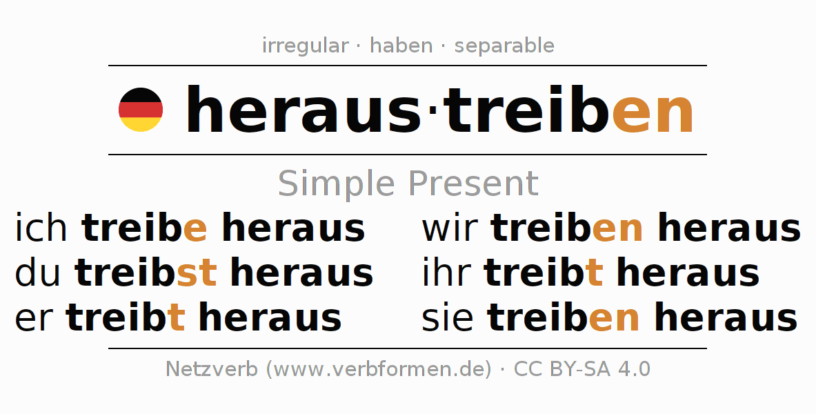 The conjugation of heraustreiben (drive out, expel) in the present tense is: ich treibe heraus, du treibst heraus, er treibt heraus, wir treiben heraus, ihr treibt heraus, sie treiben heraus. For this purpose, the endings -e, -st, -t, -en, -t, -en are appended to the stem treib. The prefix heraus- of heraustreiben is separated.The formation of the forms corresponds to the grammatical rules for the conjugation of the verbs in the present tense. Comments ☆