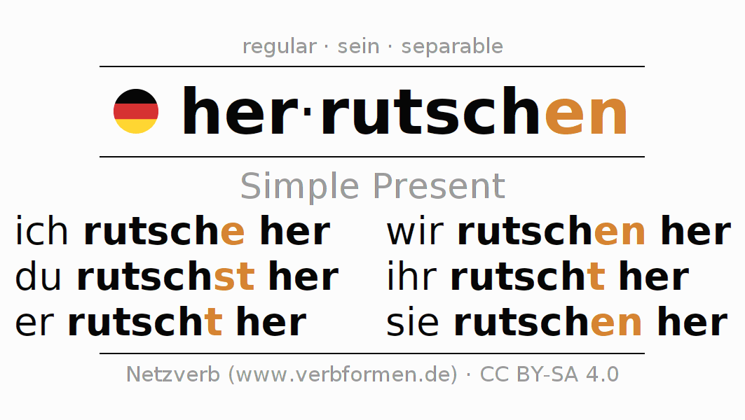 The conjugation of herrutschen (slide down, slip) in the present tense is: ich rutsche her, du rutschst her, er rutscht her, wir rutschen her, ihr rutscht her, sie rutschen her. For this purpose, the endings -e, -st, -t, -en, -t, -en are appended to the stem rutsch. The prefix her- of herrutschen is separated.The formation of the forms corresponds to the grammatical rules for the conjugation of the verbs in the present tense. Comments ☆