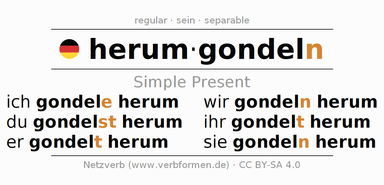 The conjugation of herumgondeln (amble, drift) in the present tense is: ich gond(e)le herum, du gondelst herum, er gondelt herum, wir gondeln herum, ihr gondelt herum, sie gondeln herum. For this purpose, the endings -e, -st, -t, -n, -t, -n are appended to the stem gondel. The endings in the 1st and 3rd person plural are shortened by "e", since the verb ends with -eln.In addition, the "e" in the stem can be omitted in the 1st person singular. The prefix herum- of herumgondeln is separated.The formation of the forms corresponds to the grammatical rules for the conjugation of the verbs in the present tense. Comments ☆