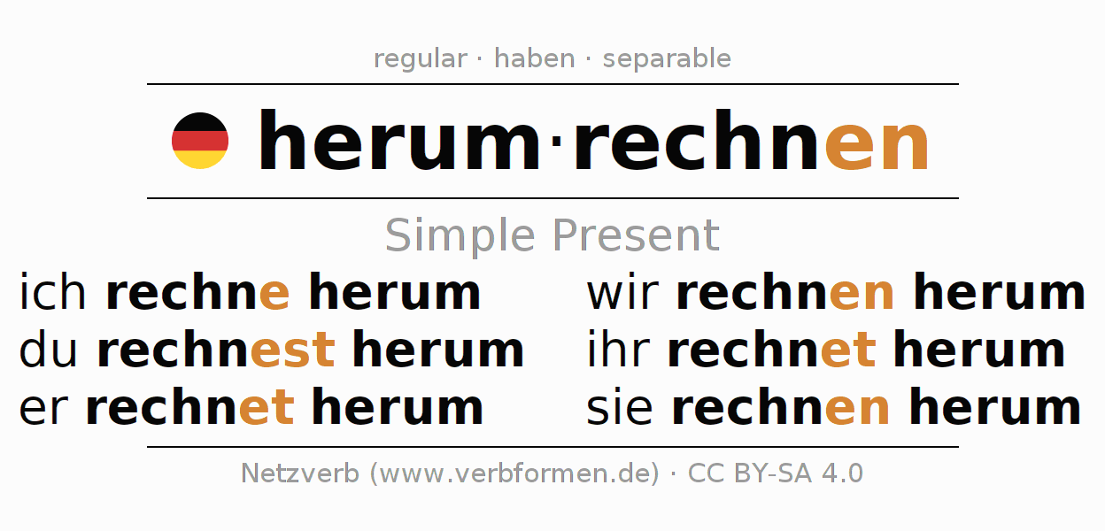 The conjugation of herumrechnen (fiddle with numbers) in the present tense is: ich rechne herum, du rechnest herum, er rechnet herum, wir rechnen herum, ihr rechnet herum, sie rechnen herum. For this purpose, the endings -e, -est, -et, -en, -et, -en are appended to the stem rechn. The endings in the 2nd and 3rd person singular and in the 2nd person plural are extended by "e", as the stem ends on -n. The prefix herum- of herumrechnen is separated.The formation of the forms corresponds to the grammatical rules for the conjugation of the verbs in the present tense. Comments ☆