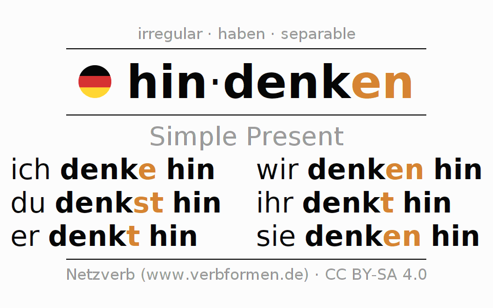 The conjugation of hindenken (aim, focus) in the present tense is: ich denke hin, du denkst hin, er denkt hin, wir denken hin, ihr denkt hin, sie denken hin. For this purpose, the endings -e, -st, -t, -en, -t, -en are appended to the stem denk. The prefix hin- of hindenken is separated.The formation of the forms corresponds to the grammatical rules for the conjugation of the verbs in the present tense. Comments ☆