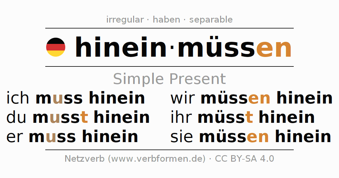 The conjugation of hineinmüssen (have to enter, must go in) in the present tense is: ich muss hinein, du musst hinein, er muss hinein, wir müssen hinein, ihr müsst hinein, sie müssen hinein. As an irregular verb (preteritopresentia) the modified stem muss- is used in the singular. In the second person singular the ending is -t; the 1st and 3rd person are without any endings. In the plural is the unaltered stem müss with the endings -en, -t, -en. The ending in the second person singular is shortened by "s", since the stem already ends on -s. The prefix hinein- of hineinmüssen is separated.The formation of the forms corresponds to the grammatical rules for the conjugation of the verbs in the present tense. Comments ☆