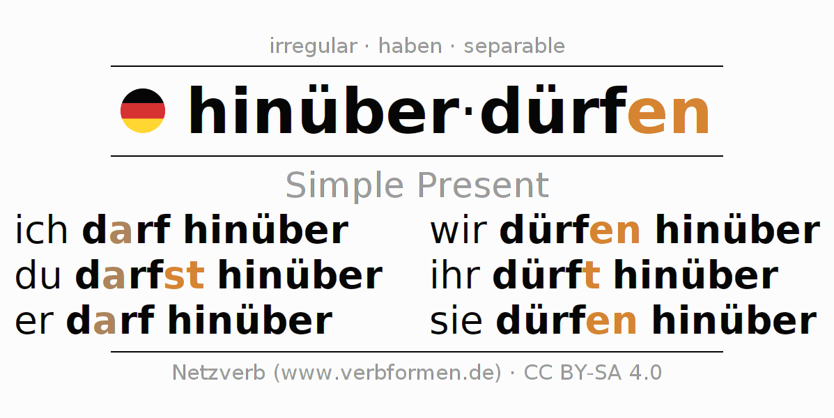 The verb hinüberdürfen fully conjugated in all persons and numbers in the Present Indicative