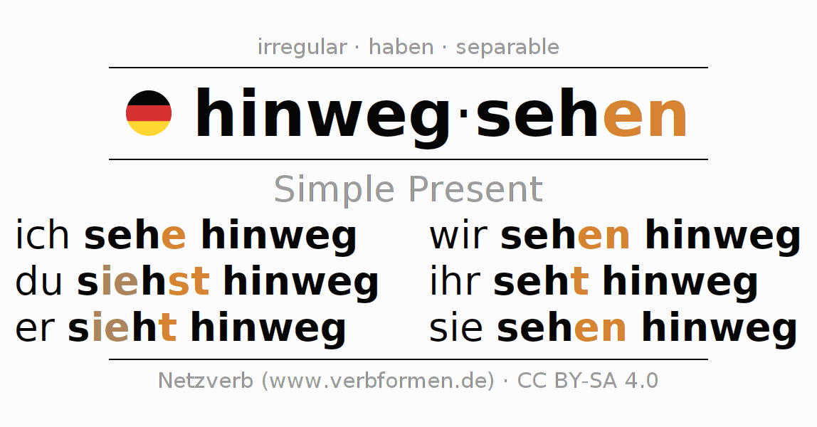The conjugation of hinwegsehen (ignore, overlook) in the present tense is: ich sehe hinweg, du siehst hinweg, er sieht hinweg, wir sehen hinweg, ihr seht hinweg, sie sehen hinweg. For this purpose, the endings -e, -st, -t, -en, -t, -en are appended to the stem seh.As an irregular verb in the 2nd and 3rd person singular the changed present stem sieh- is used. The prefix hinweg- of hinwegsehen is separated.The formation of the forms corresponds to the grammatical rules for the conjugation of the verbs in the present tense. Comments ☆