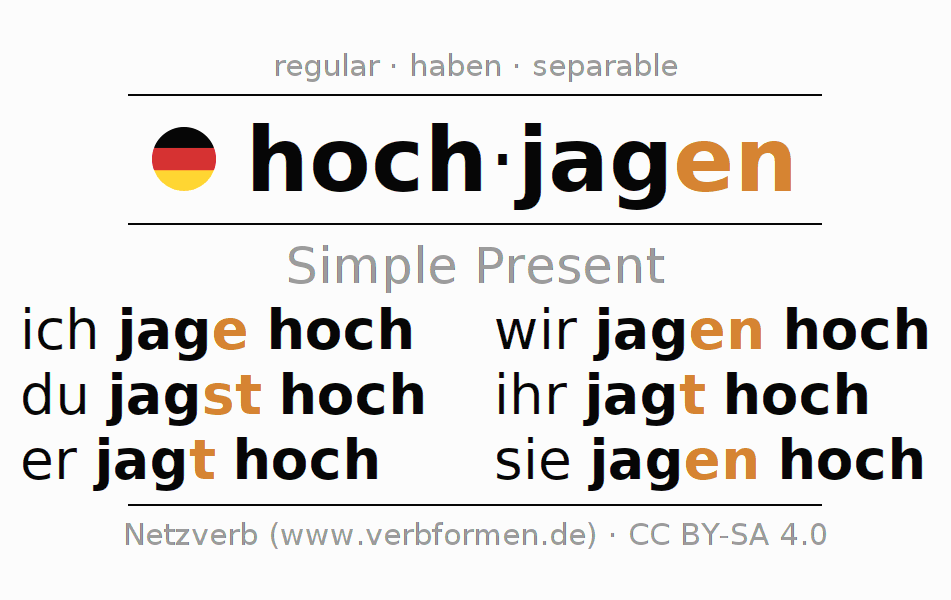 The conjugation of hochjagen (accelerate, blow up) in the present tense is: ich jage hoch, du jagst hoch, er jagt hoch, wir jagen hoch, ihr jagt hoch, sie jagen hoch. For this purpose, the endings -e, -st, -t, -en, -t, -en are appended to the stem jag. The prefix hoch- of hochjagen is separated.The formation of the forms corresponds to the grammatical rules for the conjugation of the verbs in the present tense. Comments ☆