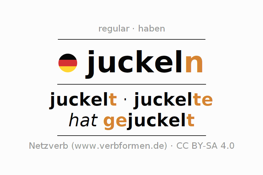 The conjugation of juckeln (fidget, squirm) in the present tense is: ich juck(e)le, du juckelst, er juckelt, wir juckeln, ihr juckelt, sie juckeln. For this purpose, the endings -e, -st, -t, -n, -t, -n are appended to the stem juckel. The endings in the 1st and 3rd person plural are shortened by "e", since the verb ends with -eln.In addition, the "e" in the stem can be omitted in the 1st person singular. The formation of the forms corresponds to the grammatical rules for the conjugation of the verbs in the present tense. Comments ☆