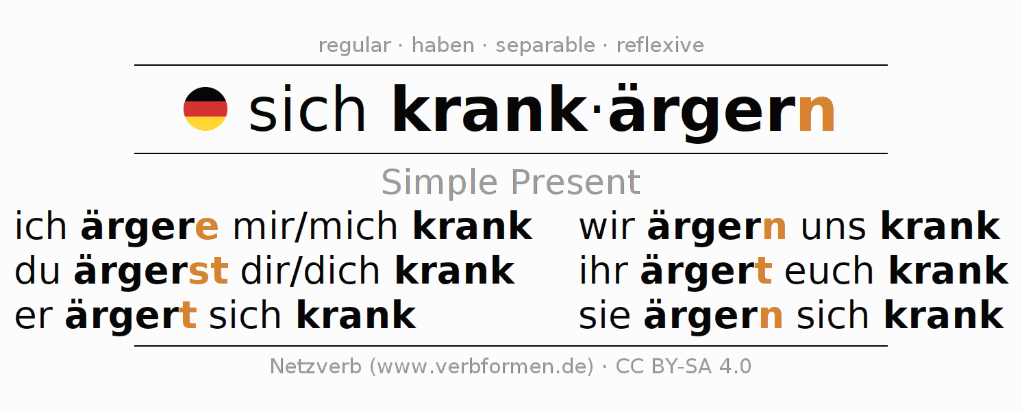 The conjugation of sich krankärgern (fret, fume) in the present tense is: ich ärg(e)re mir/mich krank, du ärgerst dir/dich krank, er ärgert sich krank, wir ärgern uns krank, ihr ärgert euch krank, sie ärgern sich krank. For this purpose, the endings -e, -st, -t, -n, -t, -n are appended to the stem ärger. The endings in the 1st and 3rd person plural are shortened by "e", since the verb ends with -ern. The prefix krank- of sich krankärgern is separated.The formation of the forms corresponds to the grammatical rules for the conjugation of the verbs in the present tense. Comments