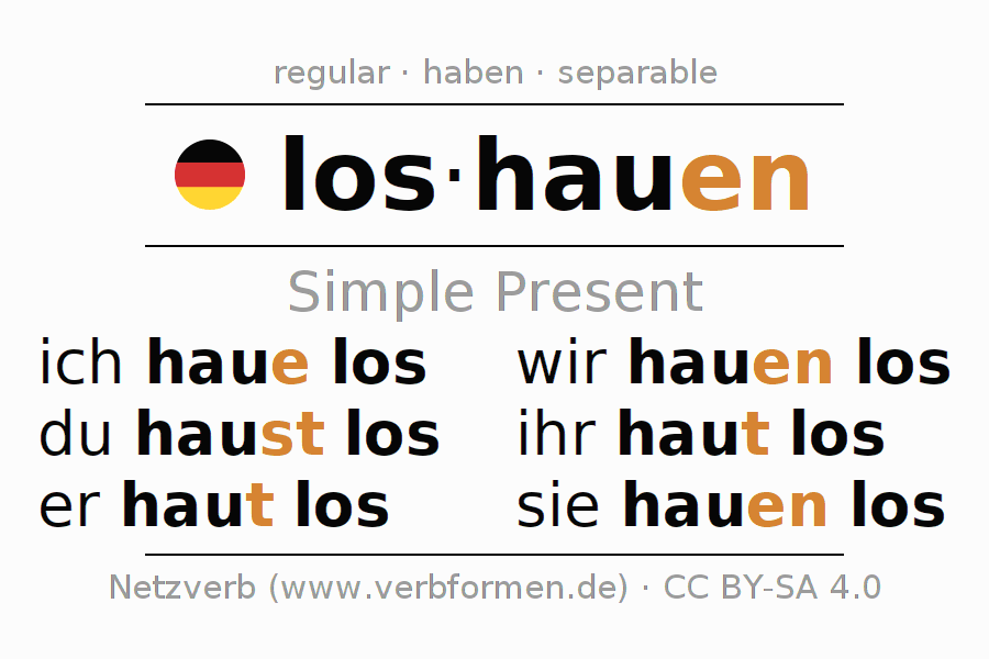 The conjugation of loshauen (attack, hit) in the present tense is: ich haue los, du haust los, er haut los, wir hauen los, ihr haut los, sie hauen los. For this purpose, the endings -e, -st, -t, -en, -t, -en are appended to the stem hau. The prefix los- of loshauen is separated.The formation of the forms corresponds to the grammatical rules for the conjugation of the verbs in the present tense. Comments ☆