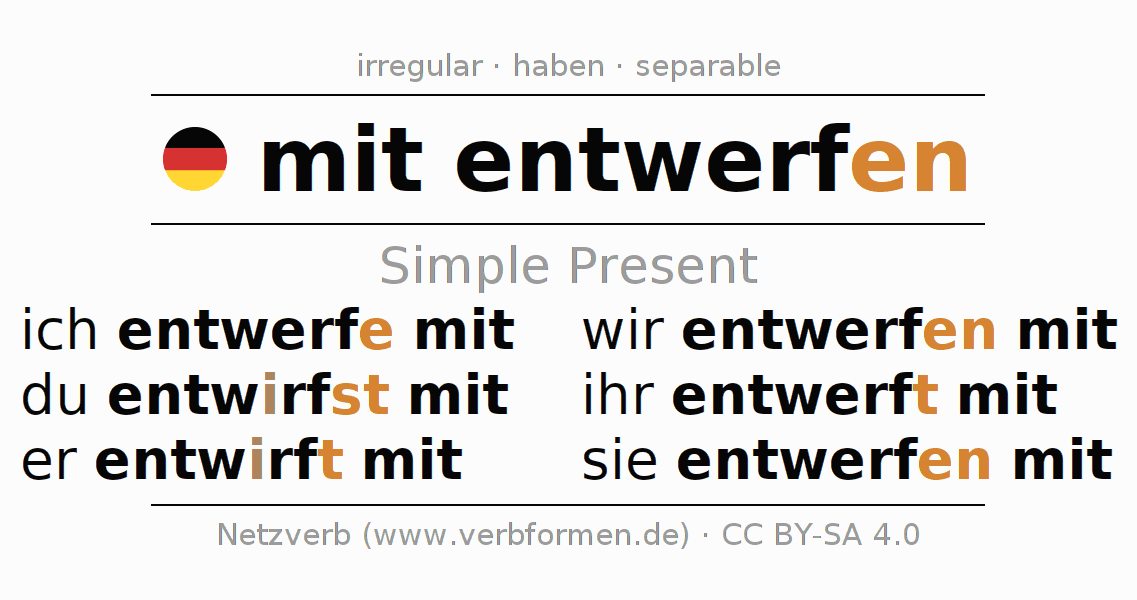 The conjugation of mitentwerfen (co-design, co-plan) in the present tense is: ich entwerfe mit, du entwirfst mit, er entwirft mit, wir entwerfen mit, ihr entwerft mit, sie entwerfen mit. For this purpose, the endings -e, -st, -t, -en, -t, -en are appended to the stem werf.As an irregular verb in the 2nd and 3rd person singular the changed present stem wirf- is used. The prefix mit - of mitentwerfen is separated.The formation of the forms corresponds to the grammatical rules for the conjugation of the verbs in the present tense. Comments ☆