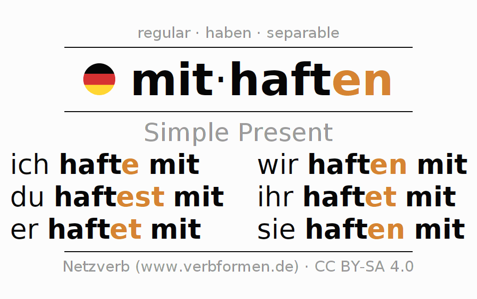 The conjugation of mithaften (co-liable, jointly liable) in the present tense is: ich hafte mit, du haftest mit, er haftet mit, wir haften mit, ihr haftet mit, sie haften mit. For this purpose, the endings -e, -est, -et, -en, -et, -en are appended to the stem haft. The endings in the 2nd and 3rd person singular and in the 2nd person plural are extended by "e", as the stem ends on -t. The prefix mit- of mithaften is separated.The formation of the forms corresponds to the grammatical rules for the conjugation of the verbs in the present tense. Comments ☆