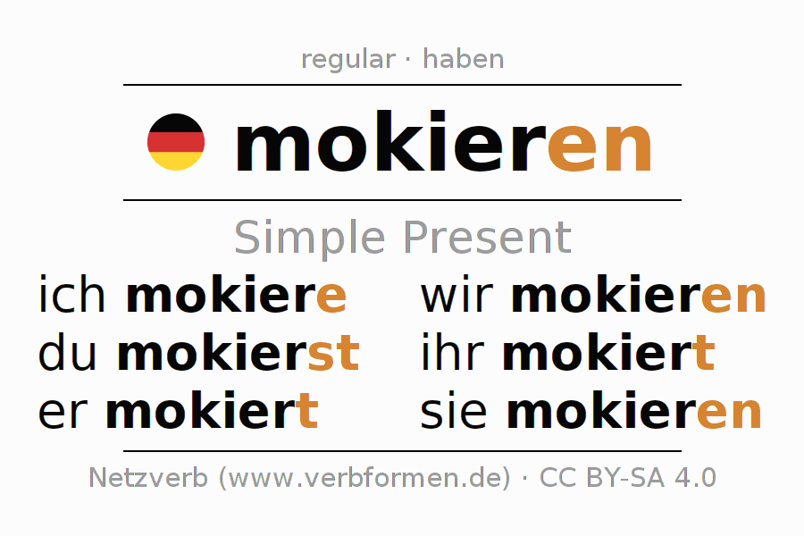 The conjugation of mokieren (mock, ridicule) in the present tense is: ich mokiere, du mokierst, er mokiert, wir mokieren, ihr mokiert, sie mokieren. For this purpose, the endings -e, -st, -t, -en, -t, -en are appended to the stem mokier. The formation of the forms corresponds to the grammatical rules for the conjugation of the verbs in the present tense. Comments ☆