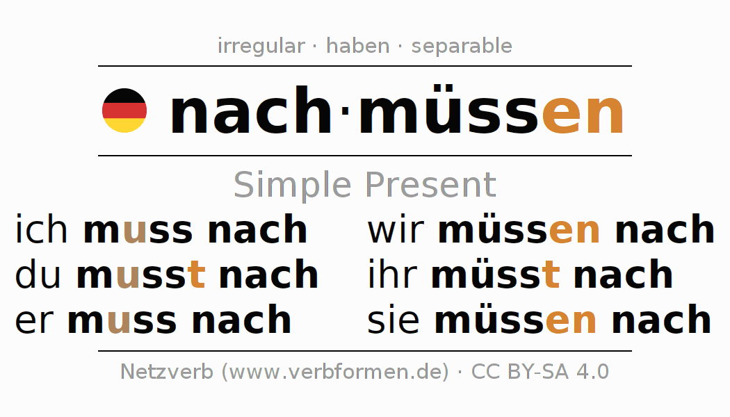 The verb nachmüssen fully conjugated in all persons and numbers in the Present Indicative