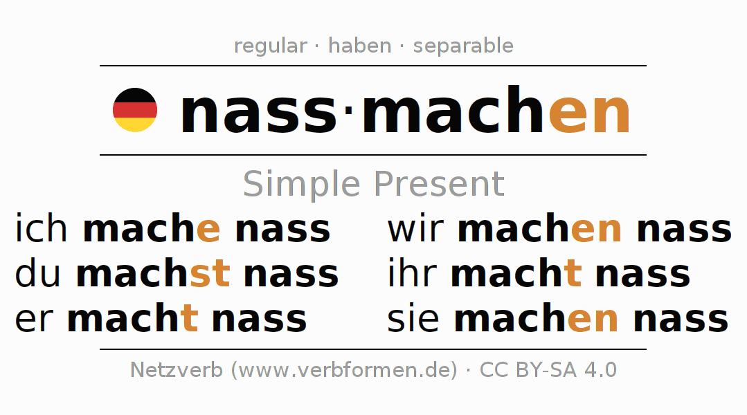 The conjugation of nassmachen (wet, drench) in the present tense is: ich mache nass, du machst nass, er macht nass, wir machen nass, ihr macht nass, sie machen nass. For this purpose, the endings -e, -st, -t, -en, -t, -en are appended to the stem mach. The prefix nass- of nassmachen is separated.The formation of the forms corresponds to the grammatical rules for the conjugation of the verbs in the present tense. Comments ☆