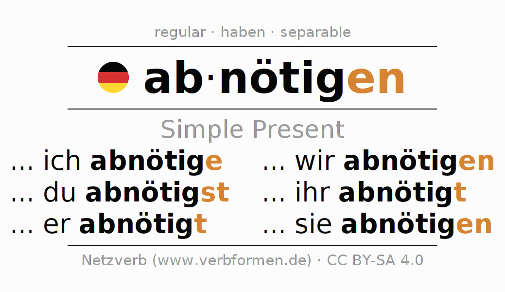 The verb abnötigen fully conjugated in all persons and numbers in the Present Indicative