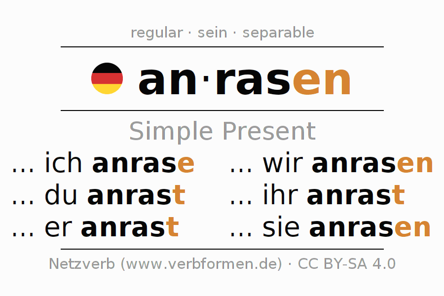 The verb anrasen fully conjugated in all persons and numbers in the Present Indicative