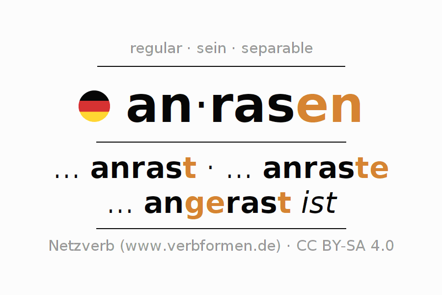 The conjugation of anrasen in Present Indicative Presence Active is ... ich anrase, ... du anrast, ... er anrast, ... wir anrasen, ... ihr anrast, ... sie anrasen.The conjugation corresponds to certain grammatical rules. Likewise the requirements for the conjugation of the simple verb forms of anrasen in Present. Comments ☆