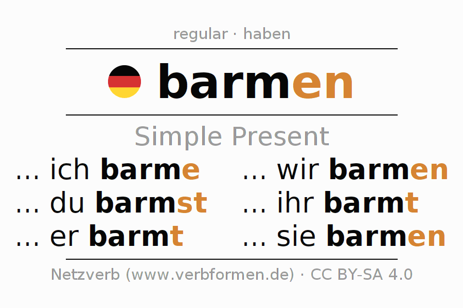 The conjugation of barmen in Present Indicative Presence Active is ... ich barme, ... du barmst, ... er barmt, ... wir barmen, ... ihr barmt, ... sie barmen.The conjugation corresponds to certain grammatical rules. Likewise the requirements for the conjugation of the simple verb forms of barmen in Present. Comments ☆