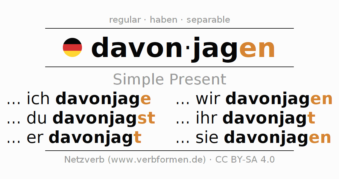 The conjugation of davonjagen in Present Indicative Presence Active is ... ich davonjage, ... du davonjagst, ... er davonjagt, ... wir davonjagen, ... ihr davonjagt, ... sie davonjagen.The conjugation corresponds to certain grammatical rules. Likewise the requirements for the conjugation of the simple verb forms of davonjagen in Present. Comments ☆