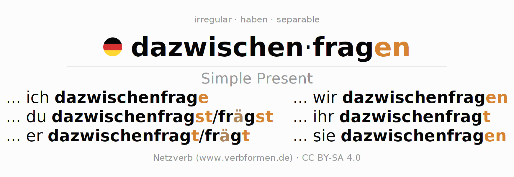 The verb dazwischenfragen (unr) fully conjugated in all persons and numbers in the Present Indicative