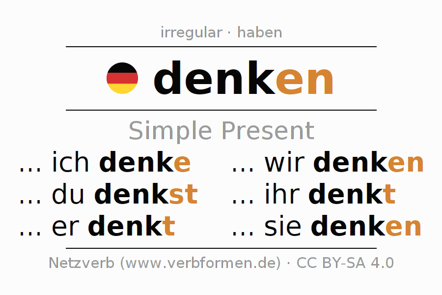 The conjugation of denken in Present Indicative Presence Active is ... ich denke, ... du denkst, ... er denkt, ... wir denken, ... ihr denkt, ... sie denken.The conjugation corresponds to certain grammatical rules. Likewise the requirements for the conjugation of the simple verb forms of denken in Present. Comments ☆