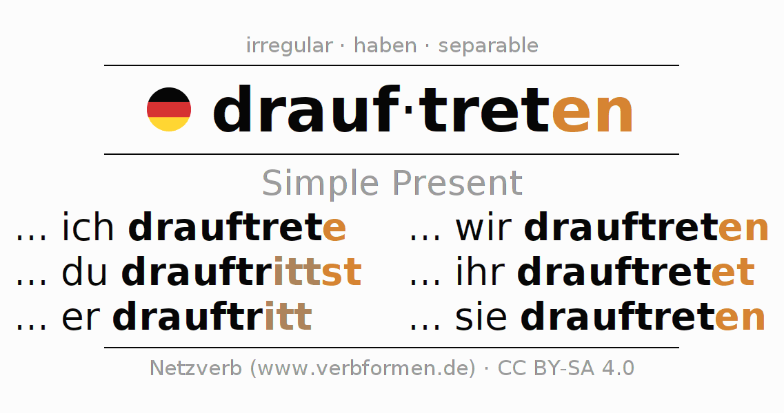 The verb drauftreten (hat) fully conjugated in all persons and numbers in the Present Indicative