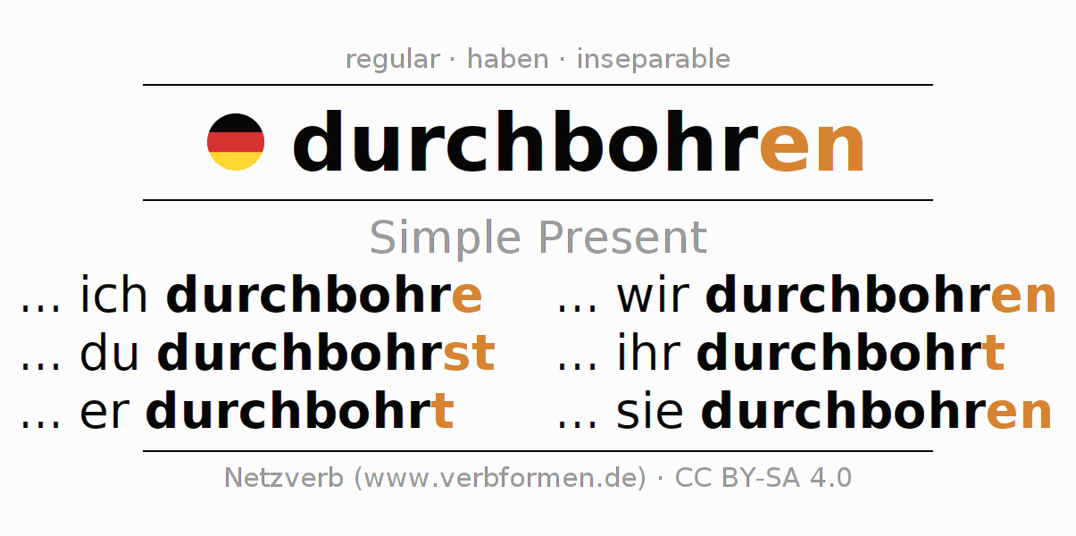 The conjugation of durchbohren in Present Indicative Presence Active is ... ich durchbohre, ... du durchbohrst, ... er durchbohrt, ... wir durchbohren, ... ihr durchbohrt, ... sie durchbohren.The conjugation corresponds to certain grammatical rules. Likewise the requirements for the conjugation of the simple verb forms of durchbohren in Present. Comments ☆