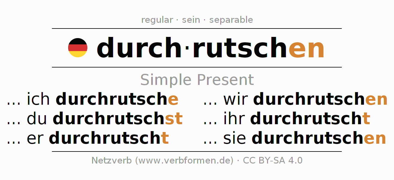 The verb durchrutschen fully conjugated in all persons and numbers in the Present Indicative