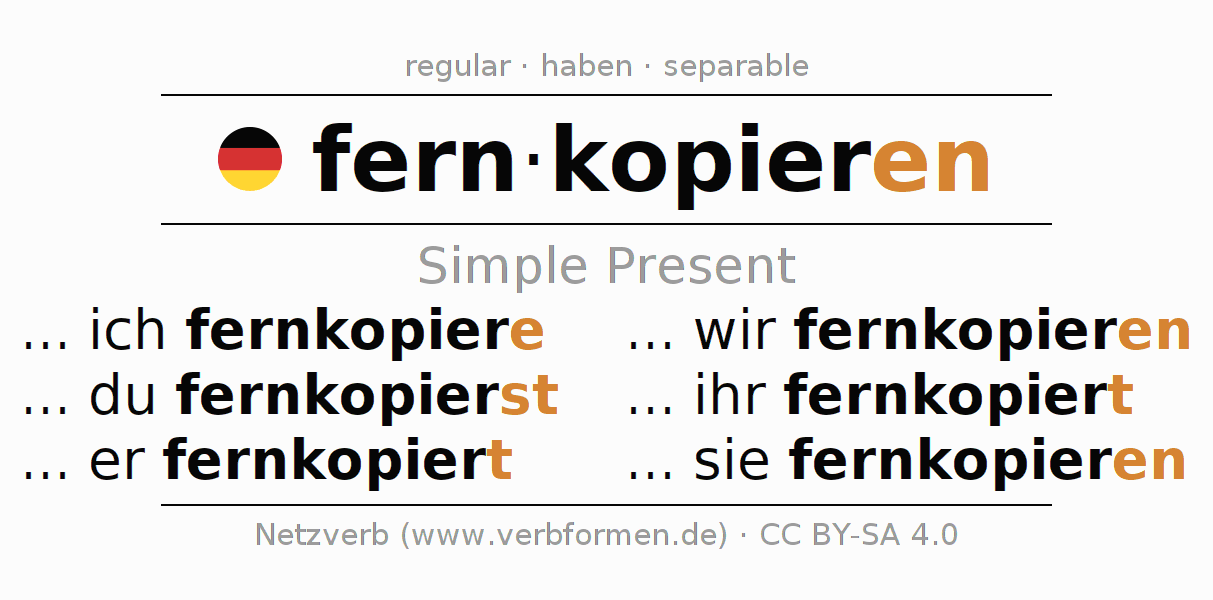 The conjugation of fernkopieren in Present Indicative Presence Active is ... ich fernkopiere, ... du fernkopierst, ... er fernkopiert, ... wir fernkopieren, ... ihr fernkopiert, ... sie fernkopieren.The conjugation corresponds to certain grammatical rules. Likewise the requirements for the conjugation of the simple verb forms of fernkopieren in Present. Comments ☆