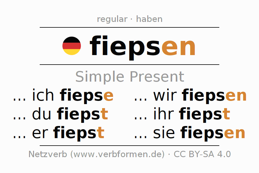 The conjugation of fiepsen in Present Indicative Presence Active is ... ich fiepse, ... du fiepst, ... er fiepst, ... wir fiepsen, ... ihr fiepst, ... sie fiepsen.The conjugation corresponds to certain grammatical rules. Likewise the requirements for the conjugation of the simple verb forms of fiepsen in Present. Comments ☆