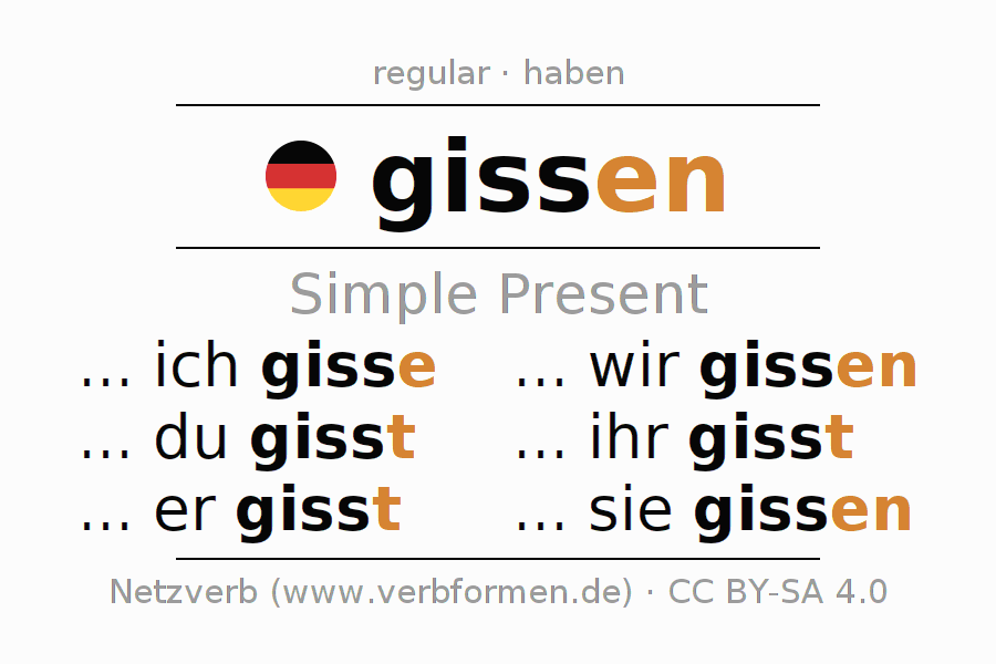 The conjugation of gissen in Present Indicative Presence Active is ... ich gisse, ... du gisst, ... er gisst, ... wir gissen, ... ihr gisst, ... sie gissen.The conjugation corresponds to certain grammatical rules. Likewise the requirements for the conjugation of the simple verb forms of gissen in Present. Comments ☆