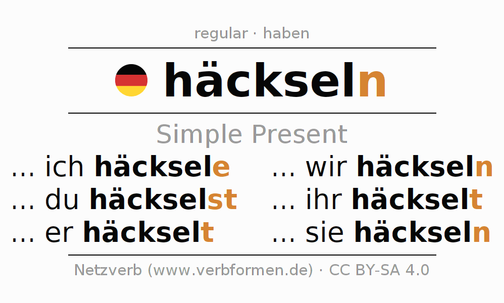The verb häckseln fully conjugated in all persons and numbers in the Present Indicative