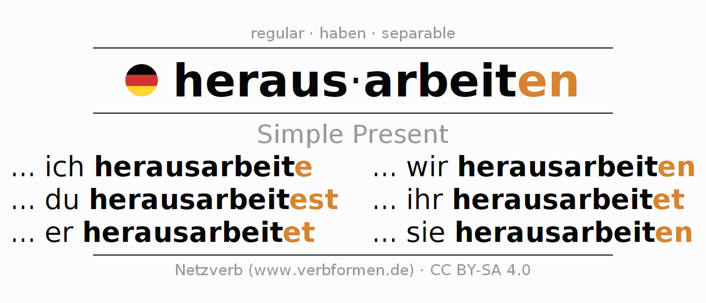 The conjugation of herausarbeiten in Present Indicative Presence Active is ... ich herausarbeite, ... du herausarbeitest, ... er herausarbeitet, ... wir herausarbeiten, ... ihr herausarbeitet, ... sie herausarbeiten.The conjugation corresponds to certain grammatical rules. Likewise the requirements for the conjugation of the simple verb forms of herausarbeiten in Present. Comments ☆